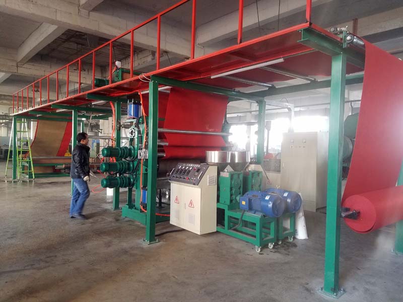 PVC與地毯復合腳墊設備:PVC復合地毯設備是目前市場上較為流行的一種家用及商業地毯。它具有環保,美觀,價廉,實用取用市場的青睞,本公司所生產的PVC及TPR復合地毯生產設備具有良好的穩定性,能連續加工多種規格的PVC底膠復合鋪地地毯,可適應多種片材或卷材培毯,可將卷材按規定的尺寸自動切割成方塊地毯,設備設計合理,操作簡單。